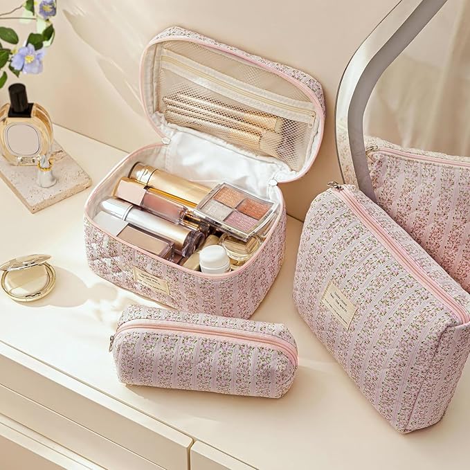 HBselect Quilted Makeup Bag, 3PCS Cotton Large Travel Makeup Bag, Cute Floral Coquette Make up Bag Cosmetic Bag Toiletry Bag for Women Girls