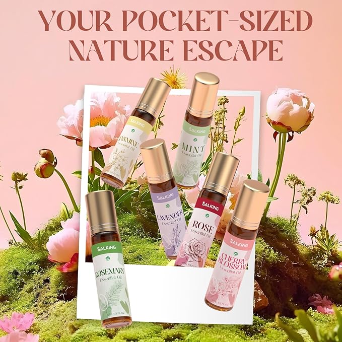 SALKING Essential Oils Roll On Set with Dried Flowers(6 Pack), Aromatherapy Oil with Roller Ball for Skin Use, Natural Fragrance Gift - Rose, Lavender, Cherry Blossom, Jasmine, Mint, Rosemary