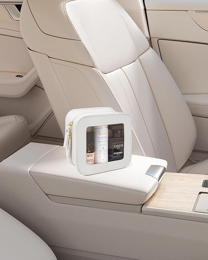 - Roomy and Stylish:Measuring Standard Size 9.25'' x 6.1'' x 2.75''(23.5cm x15.5cm x 7cm), Mini Size :5'' x 4.7'' x 2''(12.7cm x 12cm x 5cm)our clear makeup bag is elegant ,and stylish, this makeup travel organizer was designed in a minimalist boxy shape and Crafted in beautiful PU leather and finished with polished hardware, the trendy makeup bag is easy to carrying in your handbag or carry-on.