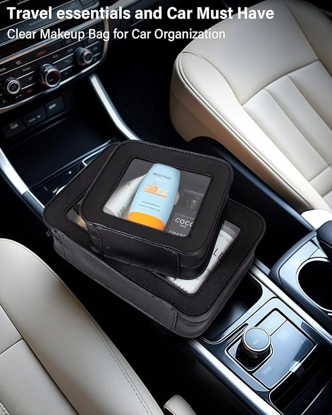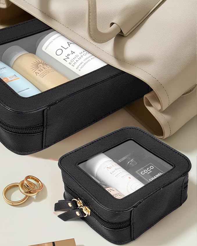 - Roomy and Stylish:Measuring Standard Size 9.25'' x 6.1'' x 2.75''(23.5cm x15.5cm x 7cm), Mini Size :5'' x 4.7'' x 2''(12.7cm x 12cm x 5cm)our clear makeup bag is elegant ,and stylish, this makeup travel organizer was designed in a minimalist boxy shape and Crafted in beautiful PU leather and finished with polished hardware, the trendy makeup bag is easy to carrying in your handbag or carry-on.