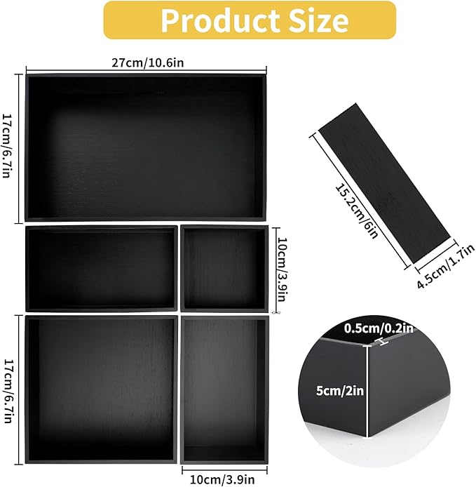 - 【Versatile 5-Piece Bamboo Drawer Organizer Set】:This set of 5 individual bamboo desk organizer caters to all your storage needs. Ideal for kitchen utensil sorting, bathroom toiletry organization, makeup storage on your vanity, office desk clutter control, and more. Keep cutlery, cosmetics, jewelry, utensils ,tea bag and odds and ends neatly arranged.