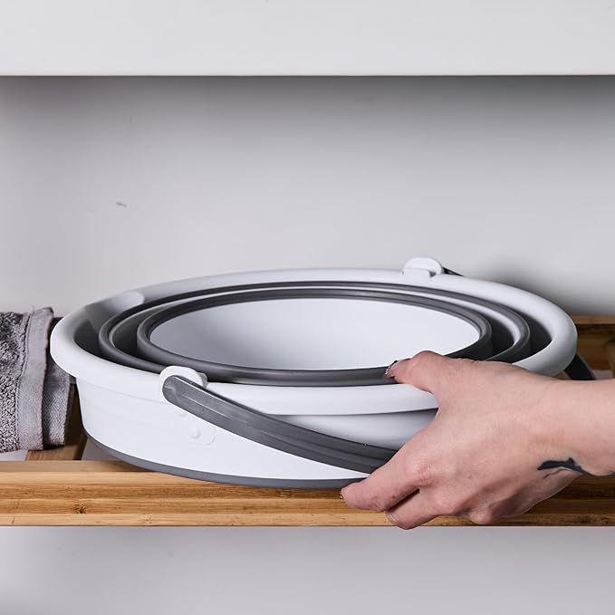 - Space-Neutral: Convenient, sturdy handle for easy carrying when filled; Handle locks in place when bucket is collapsed making it super easy to store in small and tight spaces