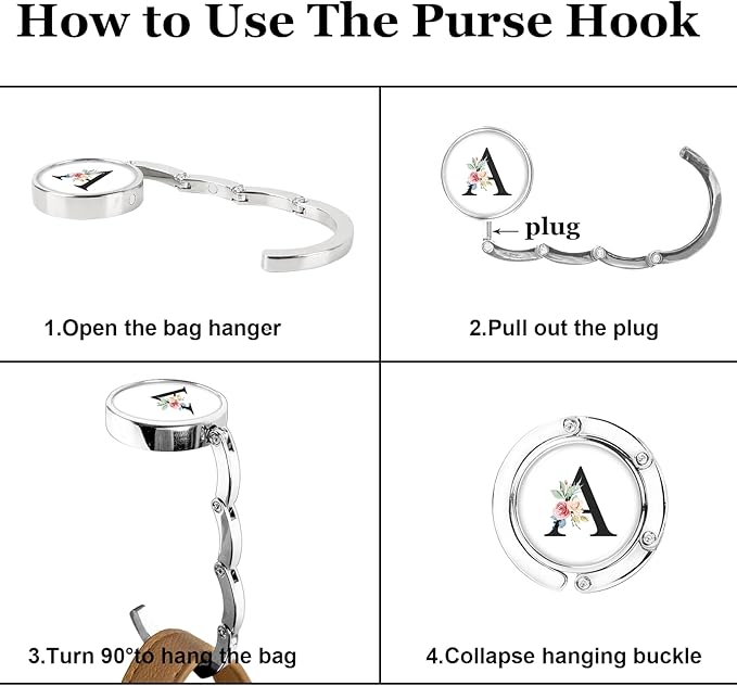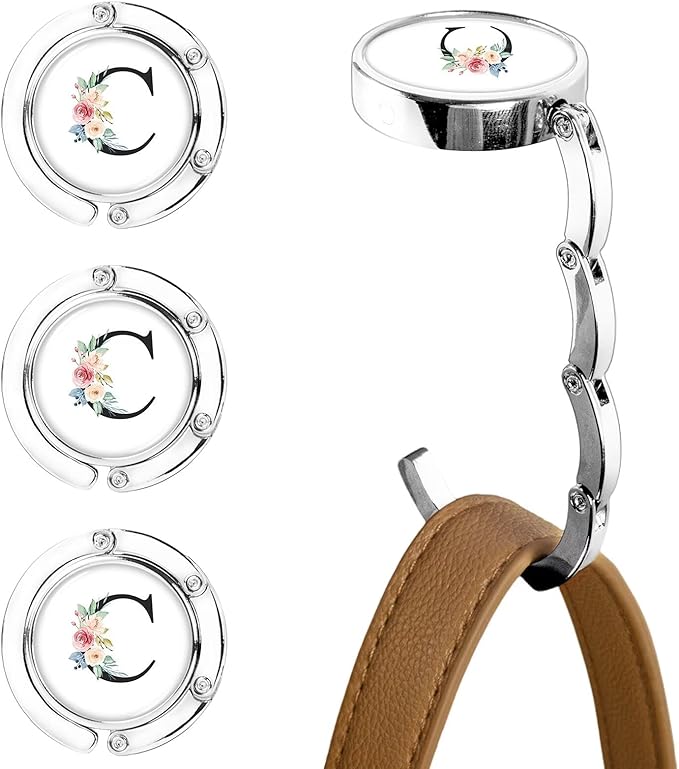 - CREATIVE LETTERS: Purse holder front disc is decorated with personalized letter stickers and printed floral pattern, unique and personalized, making purse hanger a perfect accessory for travel. Perfect gift choice for all girls and ladies. It makes a nice little gift for all kinds of holidays such as birthdays, anniversaries, Mother's Day and Valentine's Day.