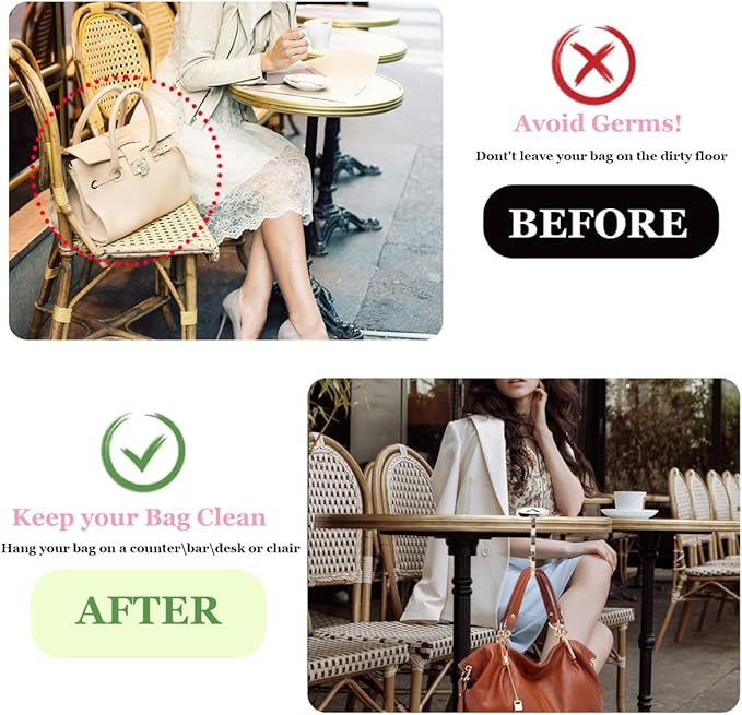 - KEEP CLEAN: Folding handbag hanger can keep your bag clean, you don't need to put your bag on dirty floor or crowded chairs, unfold the purse hook and put it on the edge of the table or stool, keep your bag or purse safe in the restaurant, office or anywhere.