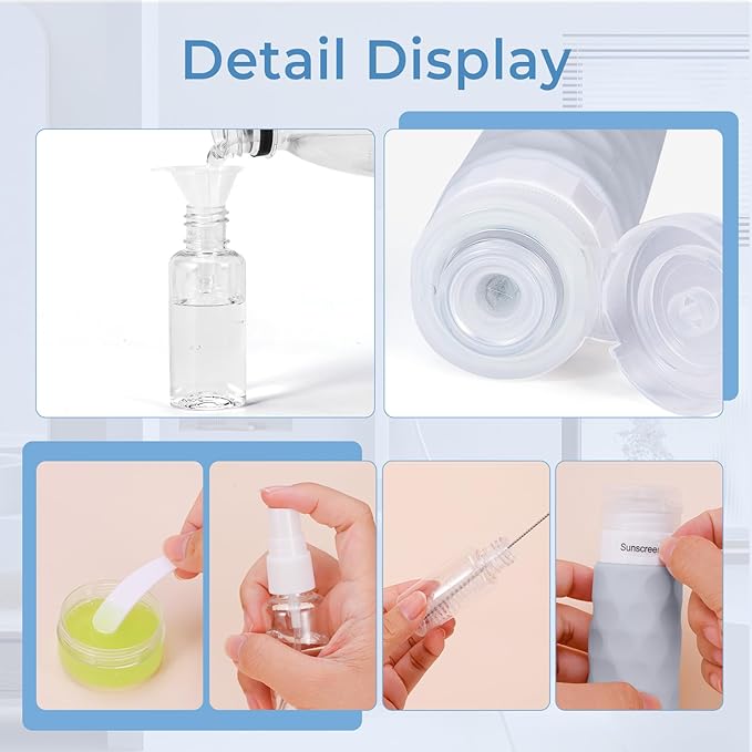 - 【16PCS Travel Toiletries Containers】This Travel Set includes 4 travel bottles, 4 travel jars, 2 spray bottles, 2 spoons, 1 funnel, 1 cleaning brush, and 1 printed label. It offers different accessories for your needs