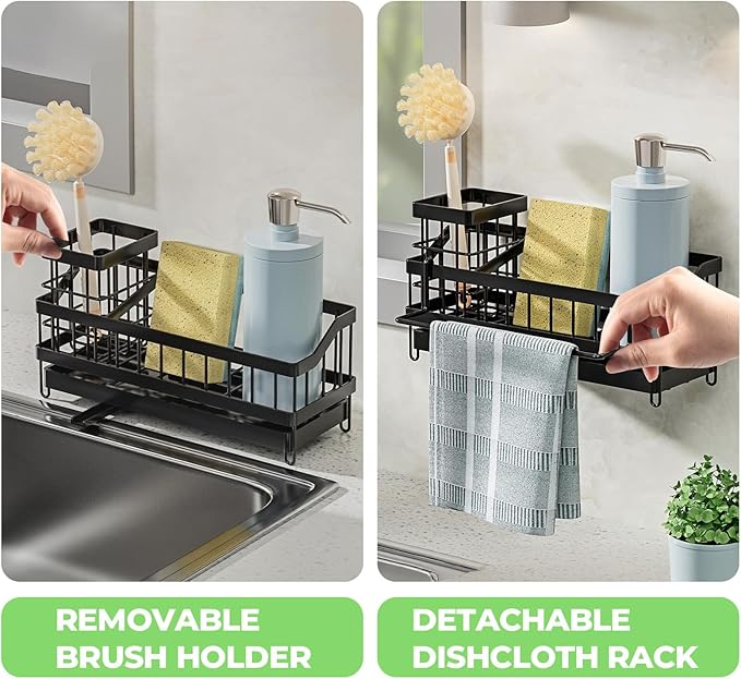 - Easy Installation & Hassle-Free Cleaning – No tools required for sink dish brush holder sponge caddy placement. For wall-mounted kitchen sink organizer use, simply attach it with the sticker without drilling or any instructions. The removable drain tray allows for effortless cleaning, making it an essential kitchen sink accessory.