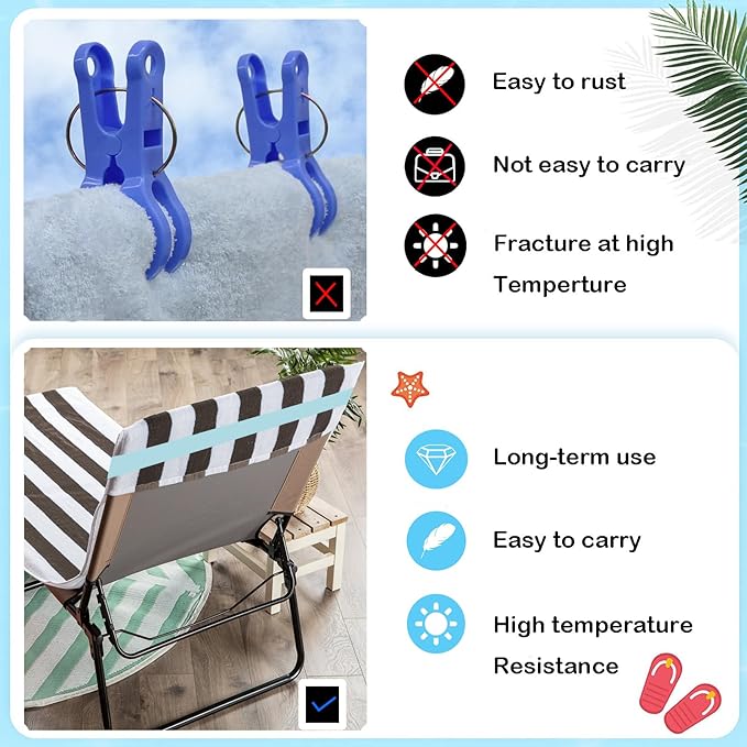 - EASY TO CARRY -- Our beach chair bands for towel are super small and lightweight, thery are more space-saving than messy clips, easier to carry and make your vacation more enjoyable.