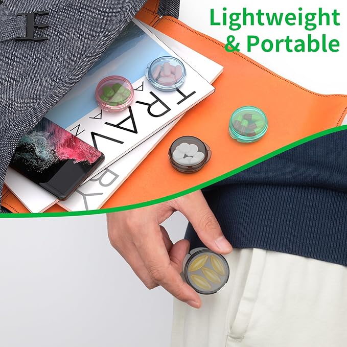 - Portable and Lightweight: the diameter of single pill organizer is 1.68inch / 4.26cm, and its height is 0.66inch / 1.67cm, very compact and lightweight, easily to put in your pocket purse or handbag, ideal for use on vacation, business trip or outdoor activities
