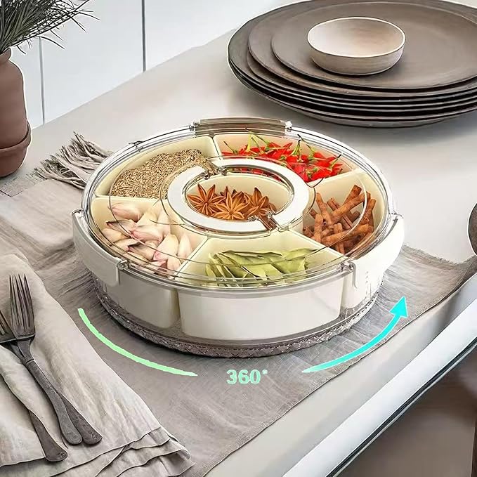 - 【Easy to Use】With its ergonomic design and built-in handle,this snack tray with lid is easy to carry and access.The wide opening makes it simple to load and clean,while the 360° rotation design allows for easy retrieval of items.