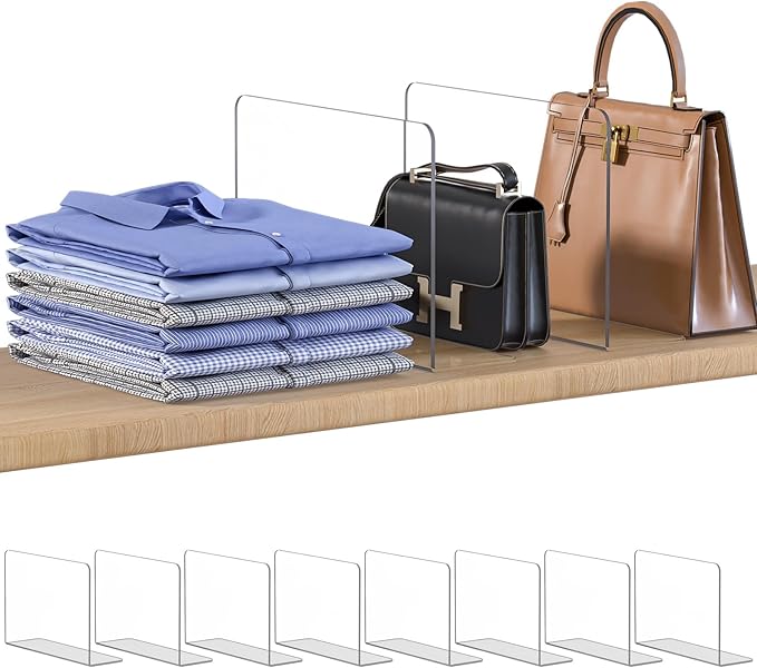 - Adjustable & Flexible for Tailored Compartments: Transform cluttered shelves into perfectly organized spaces with our easily adjustable shelf divider system. Whether you're organizing clothes, purses, handbags, or towels, these Space-Saving clothes dividers for closets can be repositioned as your needs change. This 8 PACK allows you to customize compartment sizes in your bedroom, bathroom, or closet, making it simple to separate and categorize everything from bulky jackets to delicate dresses.