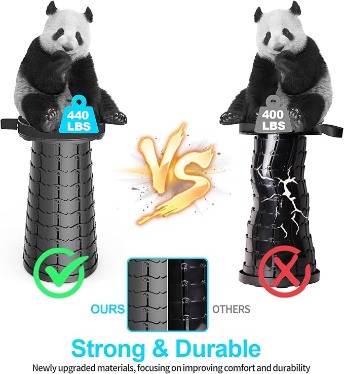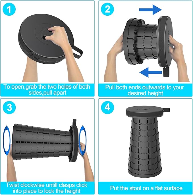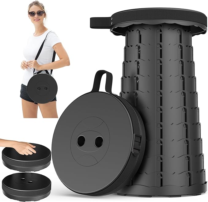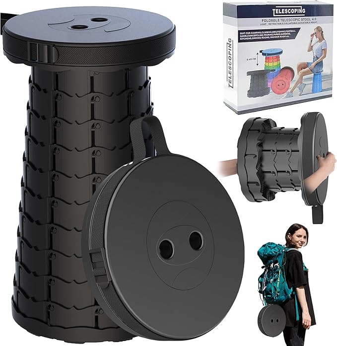 - 【Safe, Sturdy and Stable】The folding stool is made of high-quality pp material, and springs are added inside to make the telescopic stool more solid and stable. The main body of the folding stool consists of 10 segments, and each layer has multiple buckles to ensure safety, solidity, durability, stability, comfort, and a load capacity of 440 pounds.