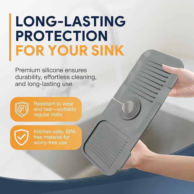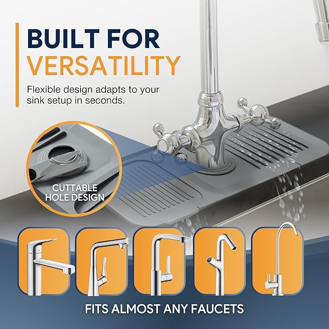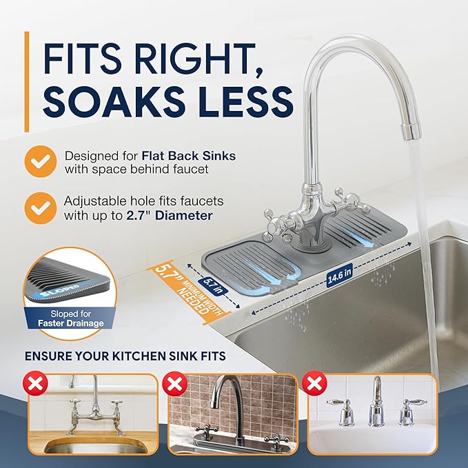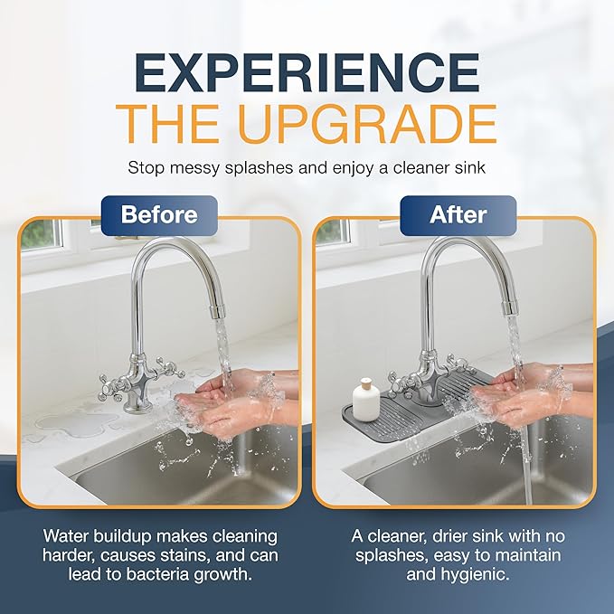 - KEEP YOUR COUNTERTOP DRY: Our silicone kitchen sink faucet mat splash guard is designed to catch every splash and redirect water straight back into the sink - no more puddles, stains, or warped countertops. Its smart 5° slope design ensures faster drainage and quicker drying, so your sink area stays clean with minimal effort.