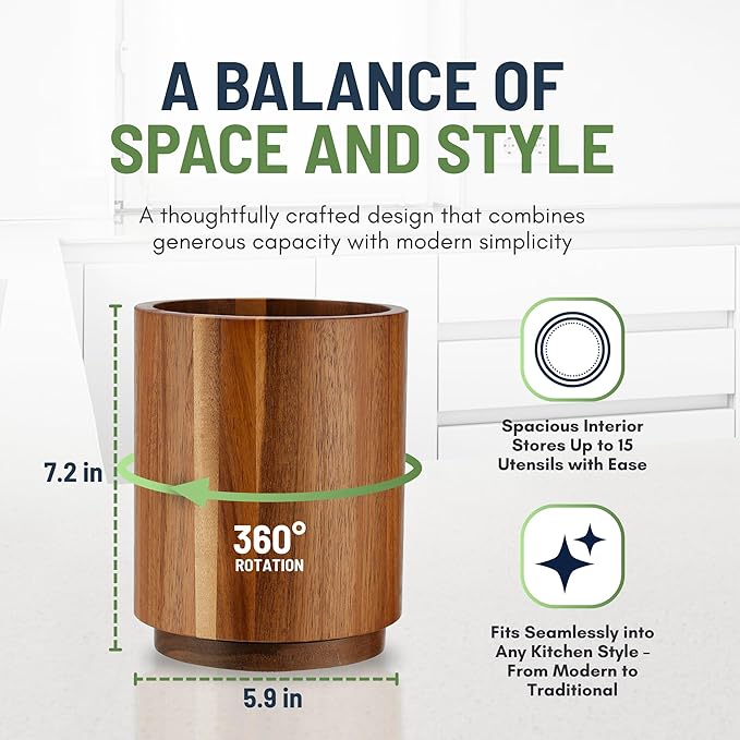 - Effortless Access with 360° Rotation – Designed for ultimate kitchen convenience, our acacia wood utensil holder rotates smoothly, letting you quickly grab the tool you need - right when you need it. No more digging through crowded kitchen utensils holder or awkward reaching - just seamless access to every utensil with a simple spin.