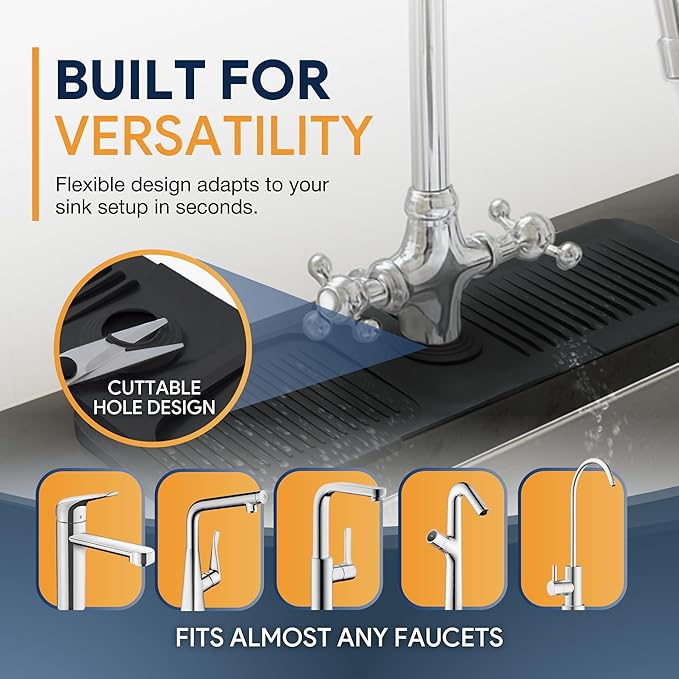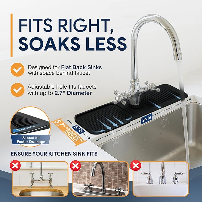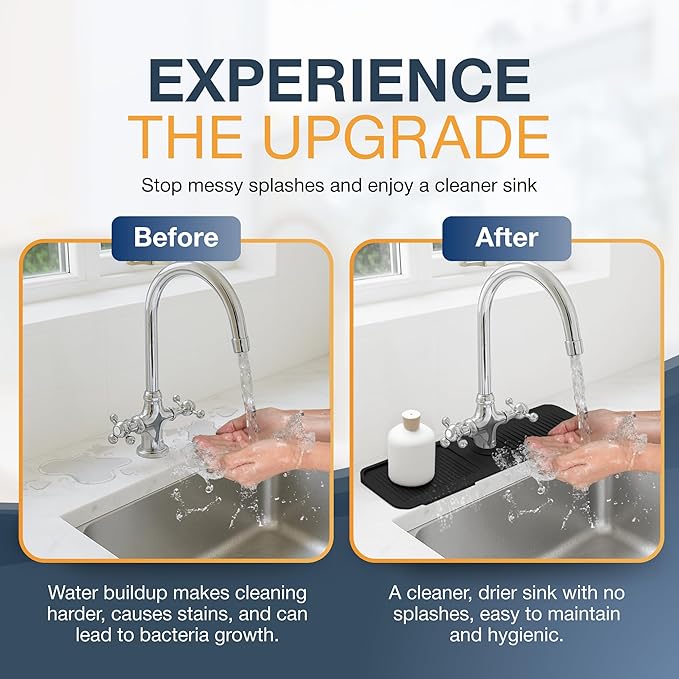 - KEEP YOUR COUNTERTOP DRY: Our silicone kitchen sink faucet mat splash guard is designed to catch every splash and redirect water straight back into the sink - no more puddles, stains, or warped countertops. Its smart 6° slope design ensures faster drainage and quicker drying, so your sink area stays clean with minimal effort.