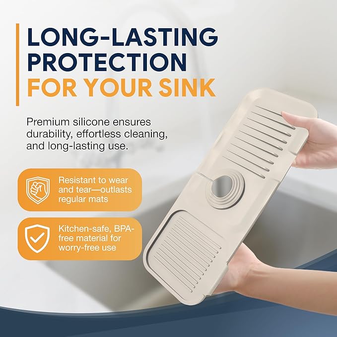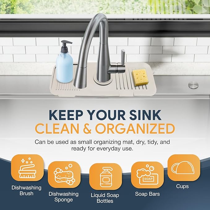 - MULTIFUNCTIONAL & TRUSTED QUALITY: More than just splash protection, our sink mat for kitchen faucet mat doubles as a mini organizer—perfect for holding your soap, sponge, or dish brush while keeping your sink area clutter-free - a must have sink accessories. As a family-owned American brand trusted by over 1 million customers, Linda’s Essentials stands behind every product. Need help? We’ll make it right.