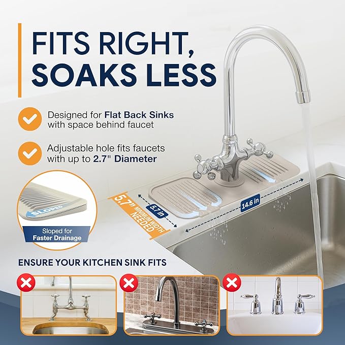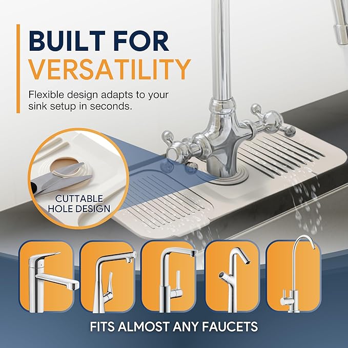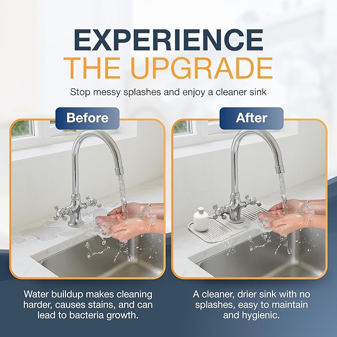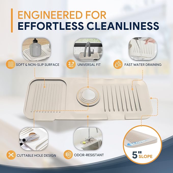 - KEEP YOUR COUNTERTOP DRY: Our silicone kitchen sink faucet mat splash guard is designed to catch every splash and redirect water straight back into the sink - no more puddles, stains, or warped countertops. Its smart 5° slope design ensures faster drainage and quicker drying, so your sink area stays clean with minimal effort.