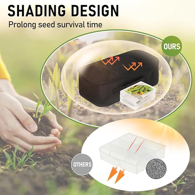 - Moisture-Proof Protection: Made from thick Oxford fabric and a reinforced zipper bag, this container shields seeds from sunlight, dust, and humidity. The airtight design keeps seeds dry and viable for longer, while the sturdy plastic slots prevent crushing—ideal for delicate or large seeds like tomatoes and sunflowers