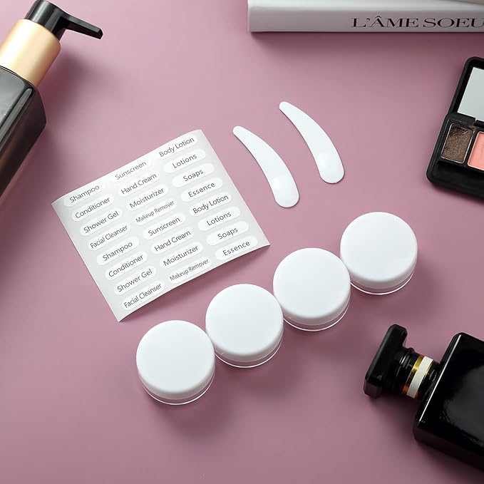 - Useful Travel Accessories: This is a nice assortment of travel containers in a useful zip case. ( Come in 4 Travel Bottles+4 Travel Jars+2 Spray Bottles+2 Scoopers+1 Funnel+1 Clean Brush + 1 Page Label + 1 Clear Toiletry Bag ) Multiple ones allow you take along different beauty products and toiletries according to your requirement