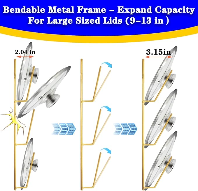 - STRONG AND RUST-PROOF: The pot lid organizer is made of high quality material with gold powder coating, sturdy and non-deformable, with smooth surface to protect the surface of pot lids from scratches.
