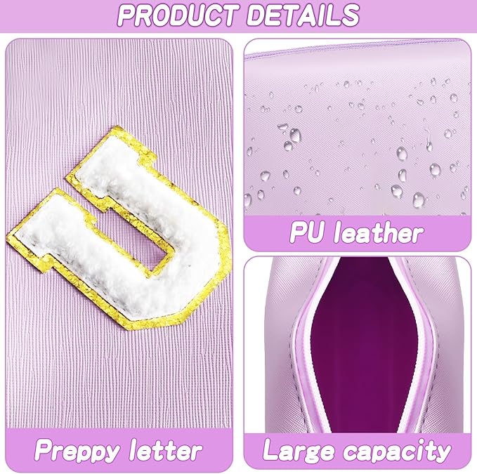- LIGHT WEIGHT AND EXCELLENT WORKMANSHIP: The initial preppy makeup bag is made of soft PU leather and is comfortable, soft and lightweight. Makeup pouch folds up when not in use and fits in a large bag without taking up space. The metal zipper pull keep your items secure and organized inside.Chenille letter pouch for women girls