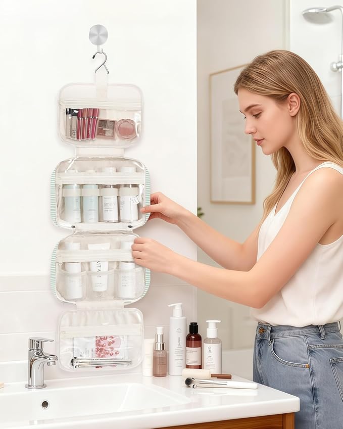 - NOT BULKY DESIGN - Large Capacity yet compact design, weighing 14 ounces. large metal hook allows hanging the toiletry case from towel rack, coat hook or whereever is available, making your toiletries and cosmetics displayed well for easy access