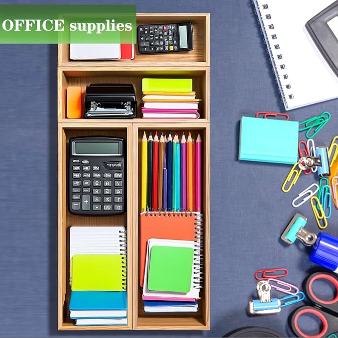 Bamboo Drawer Silverware Organizer, Flatware Organizer, Bamboo Storage Box for Office, Bathroom and other objects storage (large14.2 x5 x2 Small 9.85"x3.55"x1.78"- Set of 4)