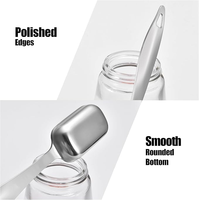 - Do Doosu square tablespoons fit inside most spice jars? Unlike round spoons, our rectangular spoons feature a narrow square shape that fits into tight spice jars, bottles and containers. With slim rectangular design, you won’t shake or pour spices over the narrow spoon—just dip in and scoop exactly what you need. It saves your spices and no more spilled powder on the counter. And long handle with outward-curved end is more ergonomic to hold; offers secure grip and better control while scooping.