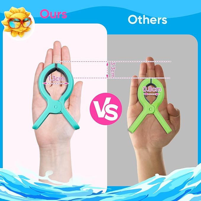 - Jumbo size: Our beach towel clips for chairs measures 4 inches in length, opening size is 3 inches, is an essential beach accessory larger than regular plastic clips. These large beach chair clips can hold thick blankets and beach towels more securely on windy days. Just enjoy your beach sun bath, swimming pool party, cruise travel, without worrying about towels falling off.