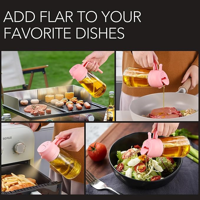 - Dual-Function Design & Multi-Purpose: Oil spray bottle for cooking offers the convenience of both spraying and pouring oil, suitable for a wide range of food preparation processes such as salad dressing, griddle, roasting, grilling