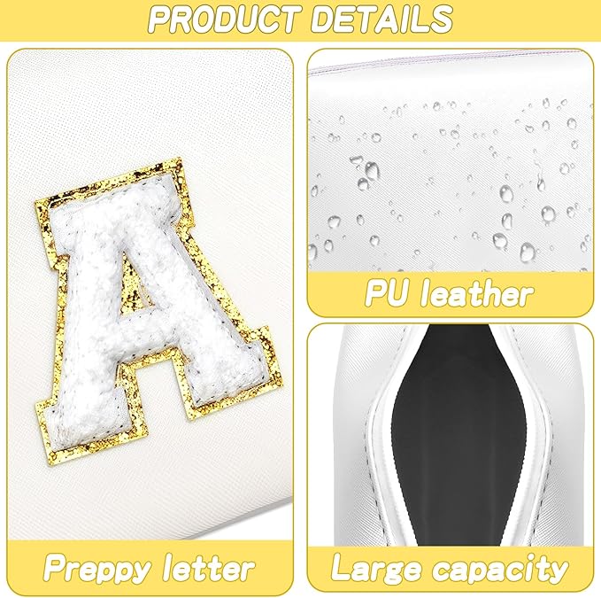 - LIGHT WEIGHT AND EXCELLENT WORKMANSHIP: The initial preppy makeup bag is made of soft PU leather and is comfortable, soft and lightweight. Makeup pouch folds up when not in use and fits in a large bag without taking up space. The metal zipper pull keep your items secure and organized inside.Chenille letter pouch for women girls