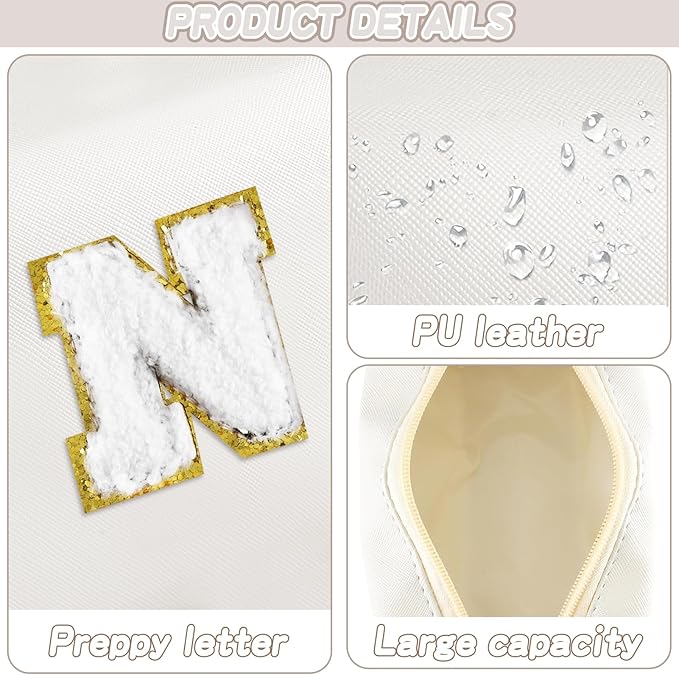 - LIGHT WEIGHT AND EXCELLENT WORKMANSHIP: The initial preppy makeup bag is made of soft PU leather and is comfortable, soft and lightweight. Makeup pouch folds up when not in use and fits in a large bag without taking up space. The metal zipper pull keep your items secure and organized inside.Chenille letter pouch for women girls