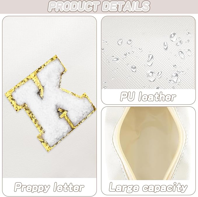 - LIGHT WEIGHT AND EXCELLENT WORKMANSHIP: The initial preppy makeup bag is made of soft PU leather and is comfortable, soft and lightweight. Makeup pouch folds up when not in use and fits in a large bag without taking up space. The metal zipper pull keep your items secure and organized inside.Chenille letter pouch for women girls
