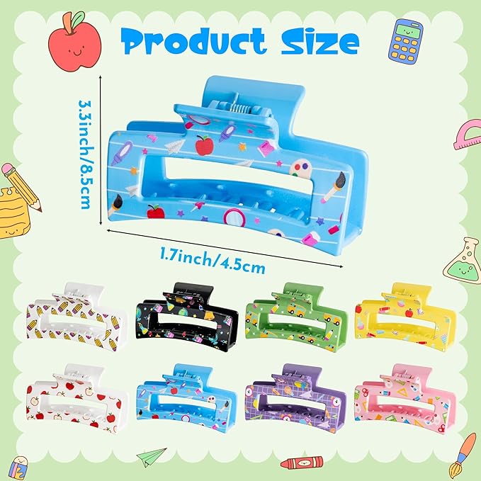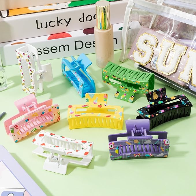 - Unique Pattern: Each of the 8 claw clips in the set has a different design and color, offering a charming variety that keeps hairstyles fresh and fun. Whether you love bright colors or classic school icons, there’s a clip to match every mood and outfit.