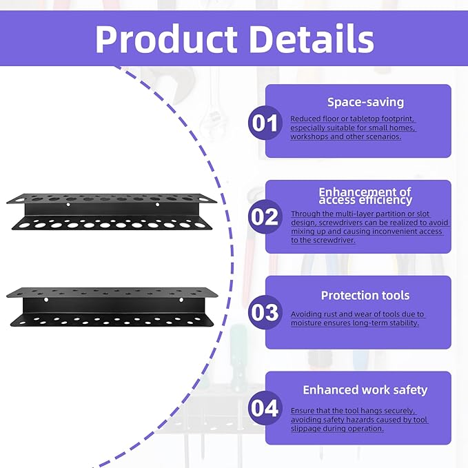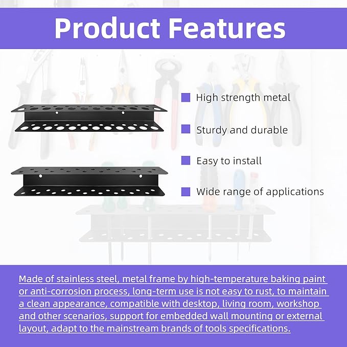 - Quick & Easy Installation – Mount securely in minutes with pre-drilled holes (compatible with screws or adhesive strips) to save wall space and keep tools within reach