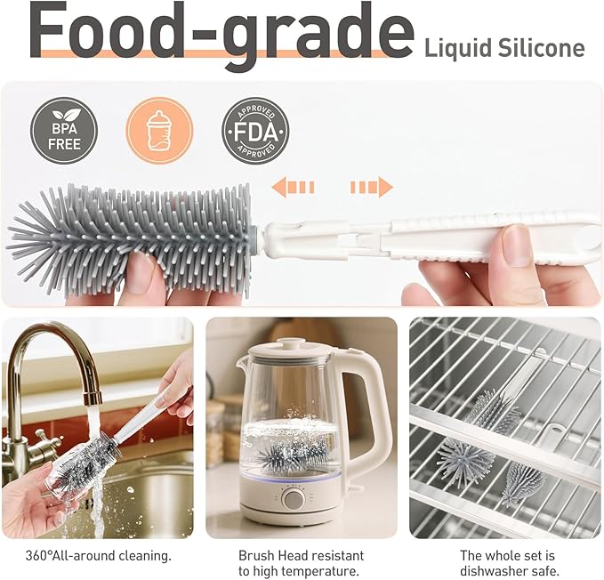 - 【Upgraded Silicone Bristles】 360° flexible silicone bristles clean better than sponge or nylon brushes - ideal for narrow-neck bottles and hard-to-reach containers.