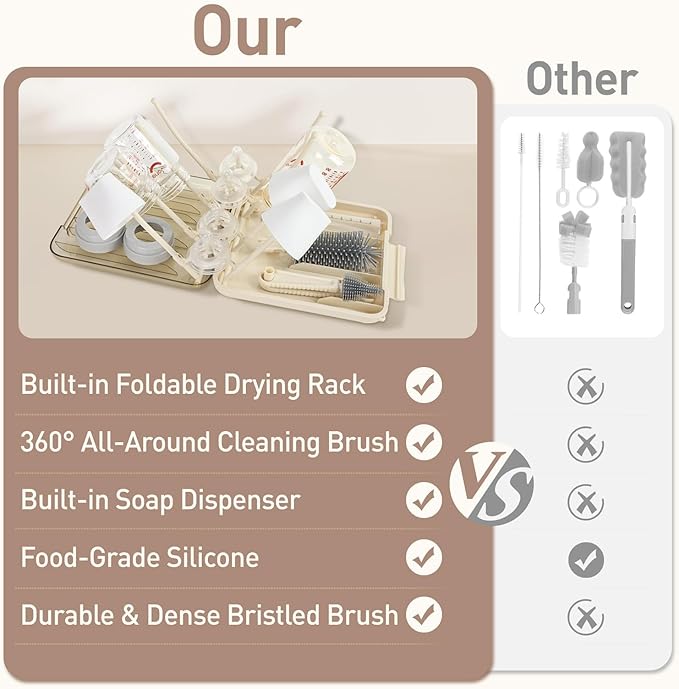 - 【All-in-One Baby Bottle Cleaning Solution】 This 6-in-1 baby bottle brush set includes a silicone bottle brush, nipple brush, straw cleaner, soap dispenser, foldable bottle drying rack, and compact.