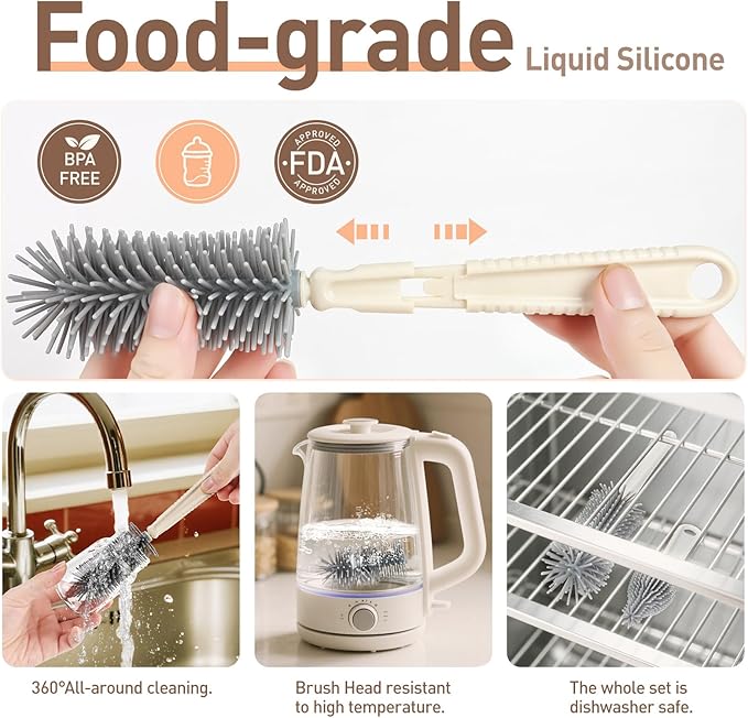 - 【Upgraded Silicone Bristles】 360° flexible silicone bristles clean better than sponge or nylon brushes - ideal for narrow-neck bottles and hard-to-reach containers.