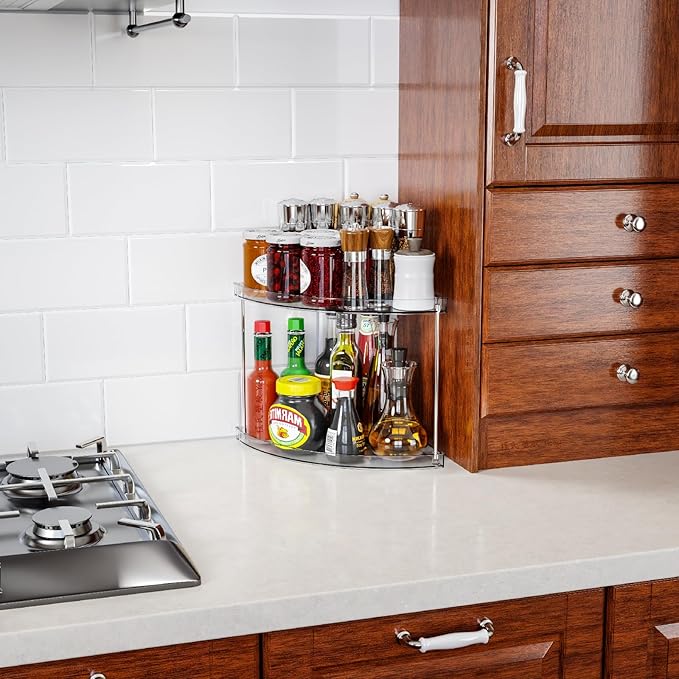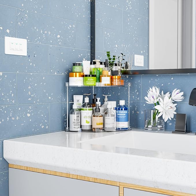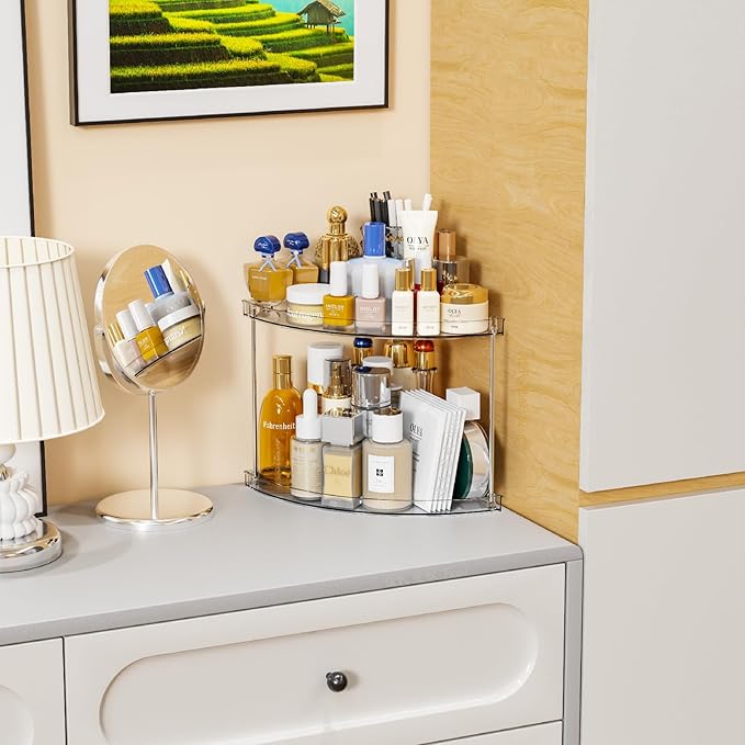 - 【Compact Tiered Design Perfume Organizer】 Designed to fit perfectly into 90° corners, this make up organizer countertop makes the most of your space. Its sleek design snugly fits into tight corners, maximizing storage without wasting an inch,suitable as bathroom corner organizer countertop,bathroom shelf,2 tier corner shelf,bathroom sink shelf,restroom organizer,corner makeup organizer,corner counter shelf,skincare stand,vanity stand,skin care shelf,coffee bar shelf for countertop