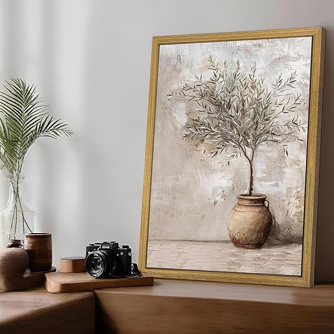 Wood Framed Olive Tree Canvas Wall Art, Room Aesthetic Oil Painting, Rustic Vintage Potted Plant Wall Decor, Neutral Botanical Artwork for Living Room Kitchen Dining Room Farmhouse Home Decor 12x16 in