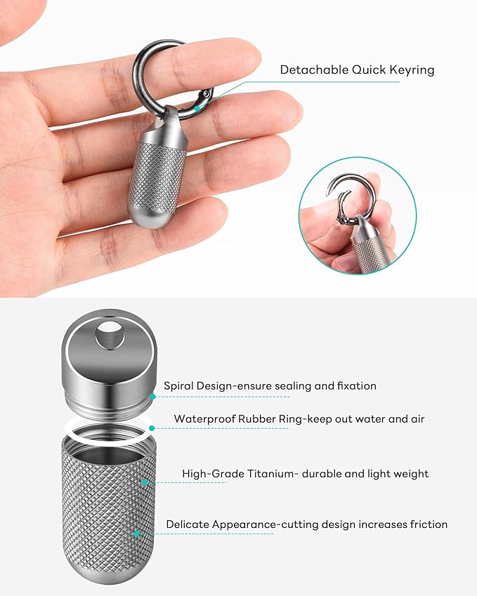 - Titanium Keychain Pill Holder: Made of high-quality titanium alloy, lightness, corrosion resistance, and durable. And the surface threads without hand slipping for ease of use.