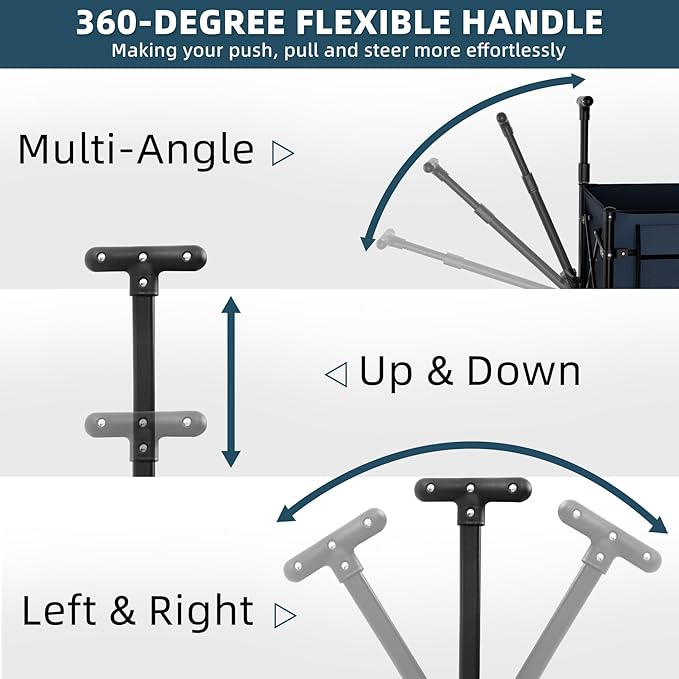 - Wide All-Terrain Wheels with Brake & Adjustable Handle - The folding wagon equipped with two front 360° rotating off-road wheels with brakes, ensuring a smooth pull and easy transport on most kinds of ground surfaces like the cobbled road, asphalt, dust, and grass. The functional handle can be easily adjusted into any angle you preferred, and 22.5'' -34'' height range is suitable for different users, to your push and pull more effortlessly.