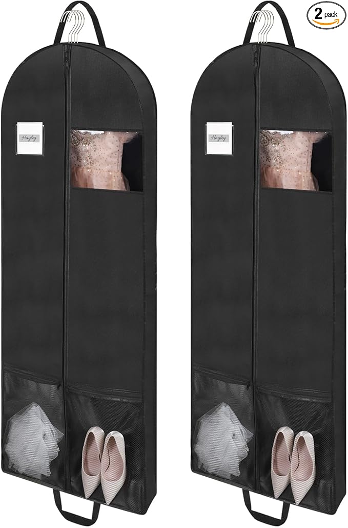 2 Pack 65" Long Garment Bags for Dress Travel Garment Bag with 4" Gusseted Wedding Dress Cover with 2 Mesh Pockets and 2 Carry Handles(Black)