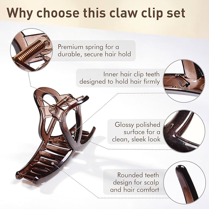 - Multi-Color: The hair claw clip set is available in two classic and versatile colors, designed to complement any outfit and occasion. The soft glossy finish in dark brown and light brown blends seamlessly with all hair shades, making it easy to achieve a natural and polished look. Packaged in a neat and compact box, these clips are easy to carry