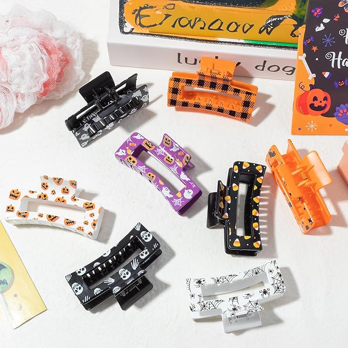- HALLOWEEN HAIR CLAW CLIPS: Our Halloween claw clips comes with 8 design, featuring spooky spider pumpkin ghost witch hat cat skeleton hand candy corn patterns, perfect for adding a touch of festival atmosphere to your look on party or daily life.