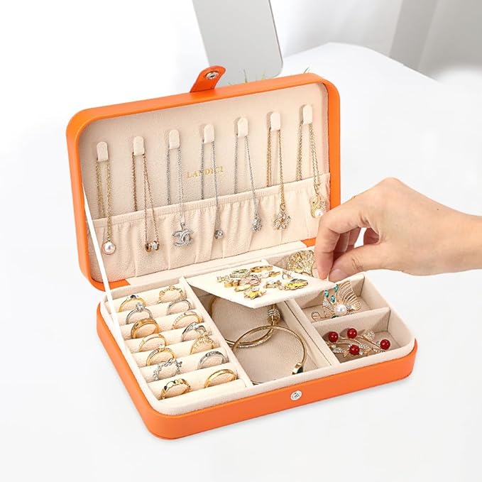 LANDICI Small Jewelry Box for Women Girls, PU Leather Travel Jewelry Case, Portable Jewelry Organizer Storage Holder Display for Ring Earrings Necklace Bracelet Bangle Men Kids Gift, Orange
