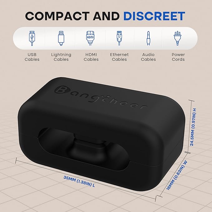 - Tidy Up All Your Cables: Each silicone cable holder measures approx.1.34 x 0.63 x 0.67 inches (35 x 16 x 17mm), with slot diameter approx. 0.27 inches (7mm). Perfect for desktops, walls, or the sides of electronics. Holds most cables such as phone chargers, HDMI cords, USB cables, power cords, Ethernet, mouse, keyboard, or headphone wires. Note: For best adhesion, wait 30 minutes after installation before use.