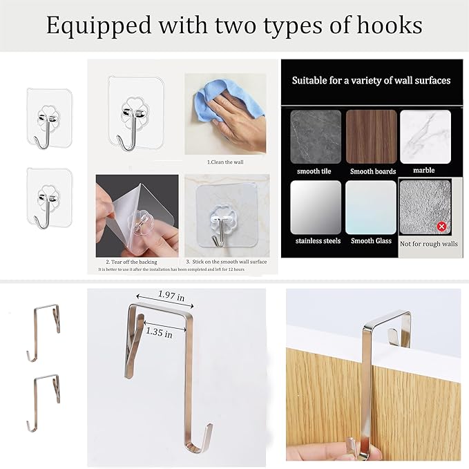 - 【Two types of hooks to hang freely】 Comes with two types of hooks, allowing you to freely choose the hanging position according to your needs. Easy installation, easy to move at any time, convenient for you to flexibly adjust the storage layout.