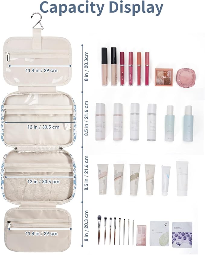 Narwey Travel Toiletry Bag for Women Large Hanging Makeup Bag Organizer Toiletries Bag for Full Size Essentials Accessories Cosmetics (Little Blue Flower (Large))