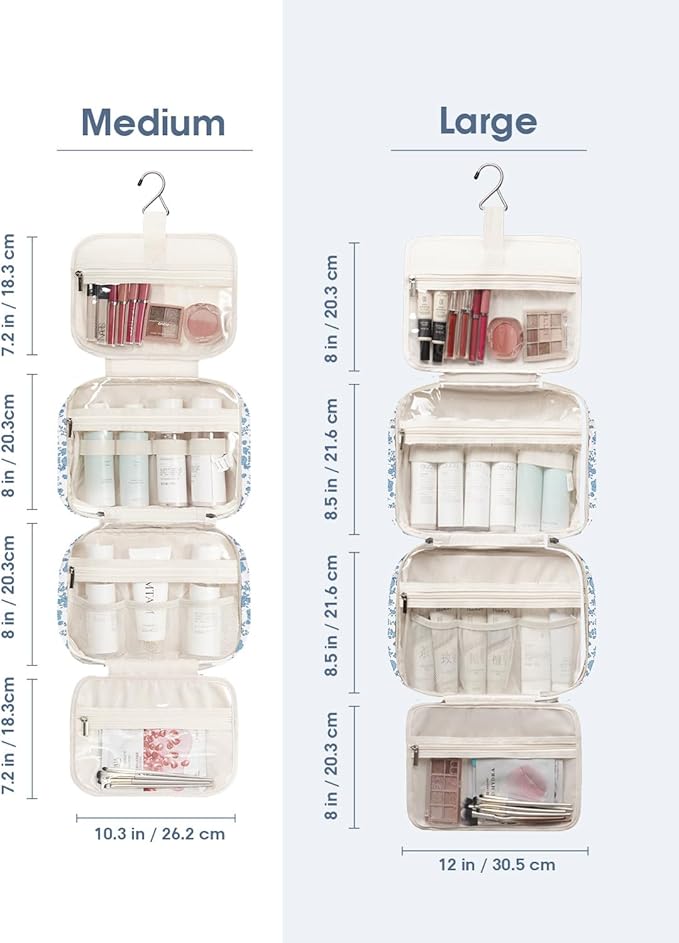 - LARGE VERSION - Fold size 12"x9"x5.5”/30.5x22x13 cm. We launch larger version to meet large-capacity, which you may choose large or medium size based on your needs. It could easily fit full-size travel essentials like shampoo & conditioner, lotion, face wash, toothpaste, toothbrushes, hair brush and daily makeups