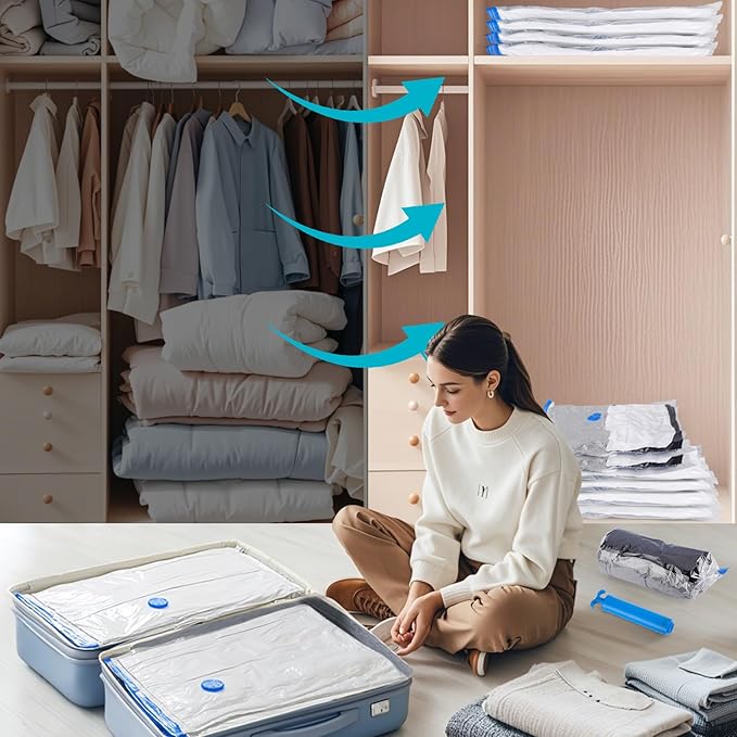 Vacuum Storage Bags with Hand Pump, 12 Jumbo Compression Space Saver Vacuum Seal Bags for Clothing, Travel, Luggage, Comforters, Blankets, Pillows, Bedding, Duvets
